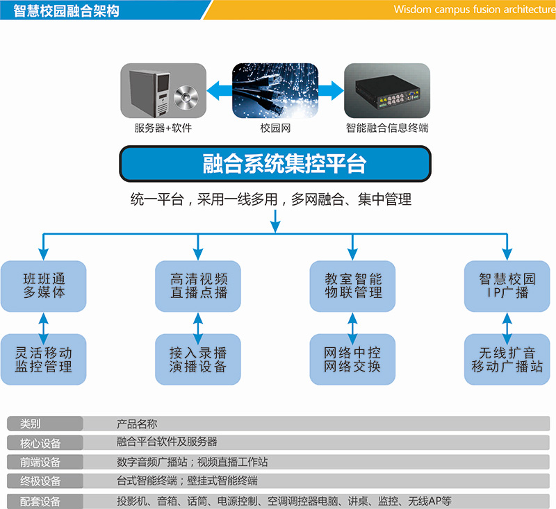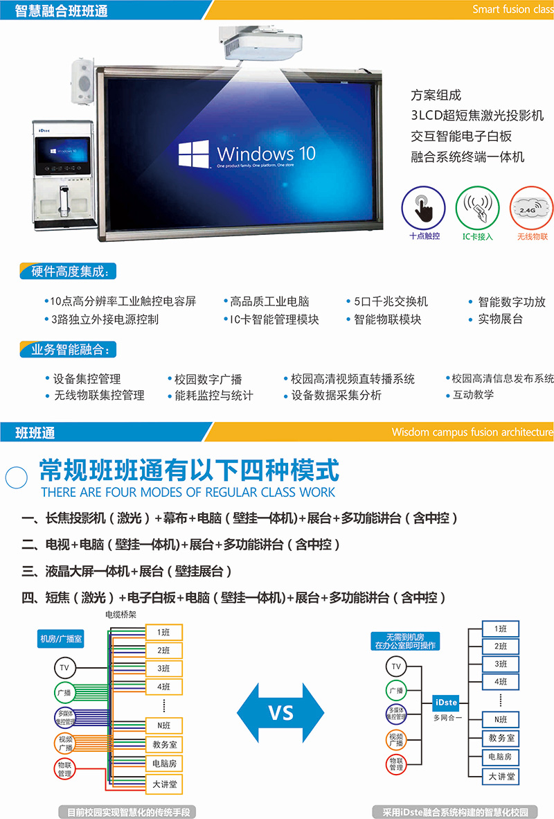 智慧融合班班通组成部分:短焦液晶激光投影机+互动电子白板+智能融合终端一体机(千兆交换机、网络中控、数字功放、电脑主机、音频解码、视频解码、实物展台、显示器、无线扩音、无线物联等)。